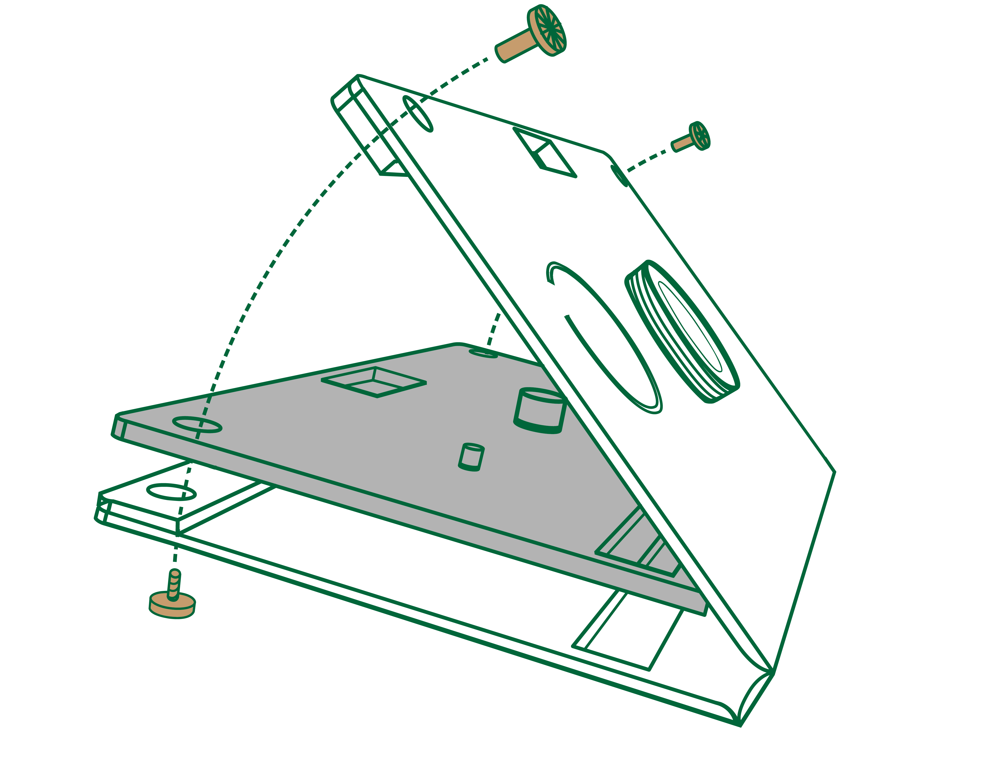 - Insert the circuit board into the three holes on the card casing and add the batteries.